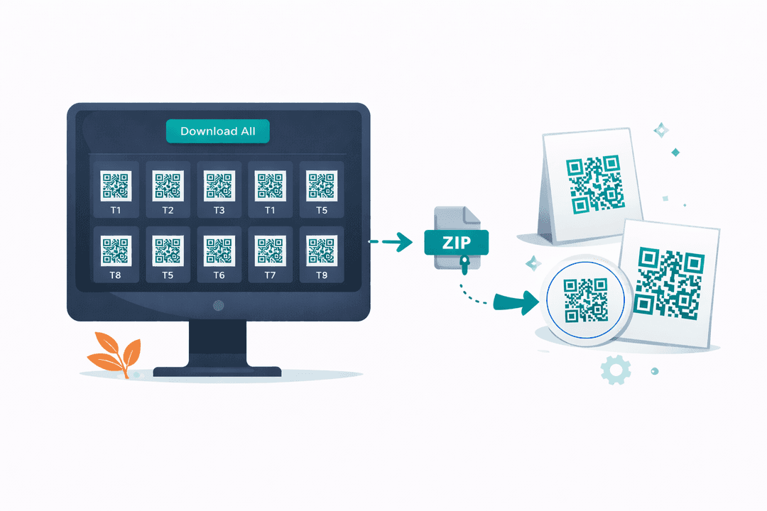 Download all your QR codes at once in a single zip file. Print them for table tents, embed them on your website, or display them on a digital screen at the entrance for takeout ordering.